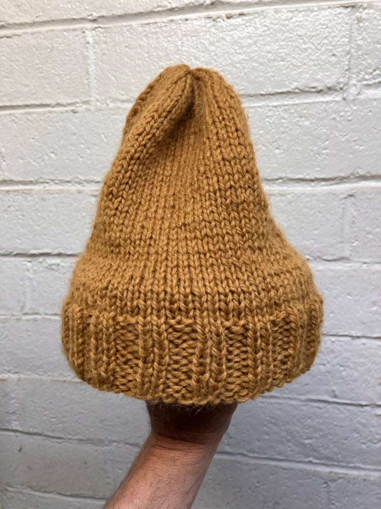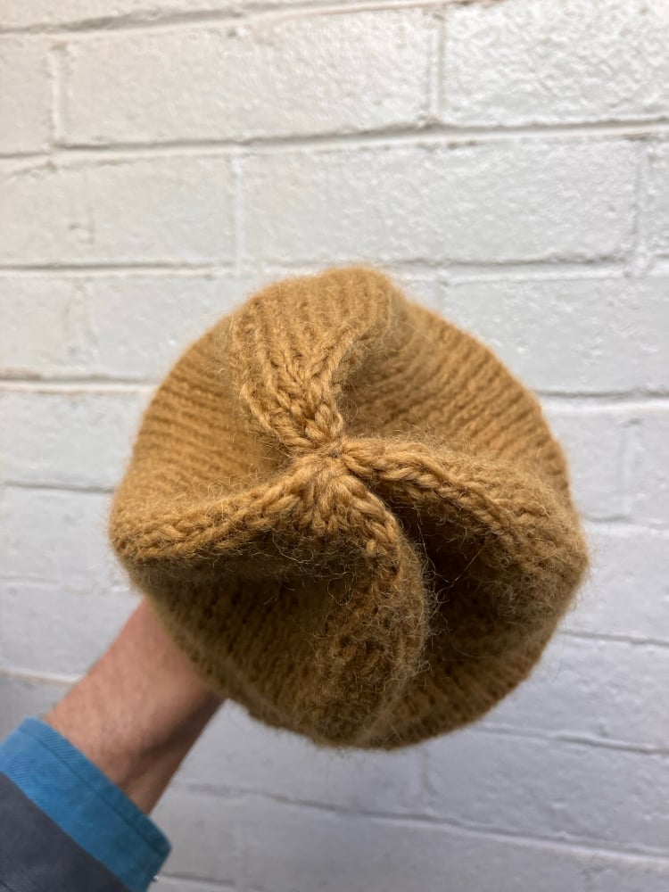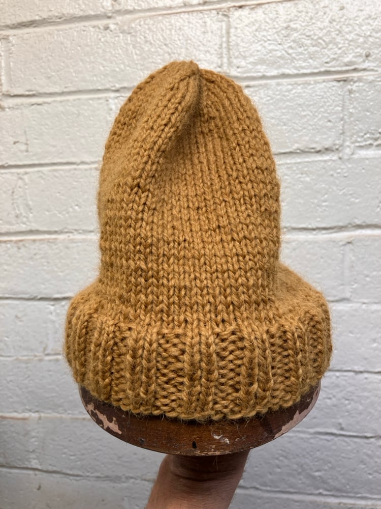 Hand knitted by Aya Muto from dead stock Switzerland Alpine Yarn, 90% virgin wool, 10% mohair. Soft and flexible and warm, one size fits all, will form to one’s head size and shape! domestic shipping only - wooden hat stretcher not incl.